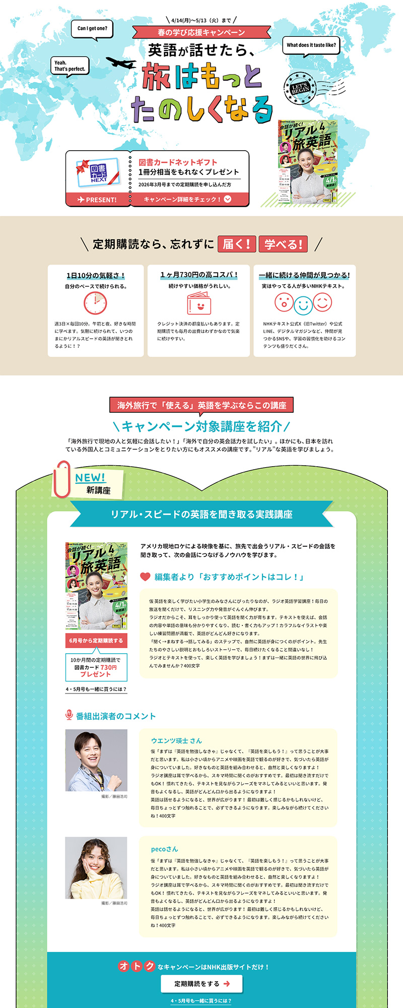 新しく始まる旅をテーマにしたリアルな英語講座に焦点を当てたランディングページ。一目で旅行と伝わるメインビジュアルと、特典をもらうために少し複雑な申し込み手順をわかりやすく伝えるために画面ショットを多様して1画面づつ説明しています。